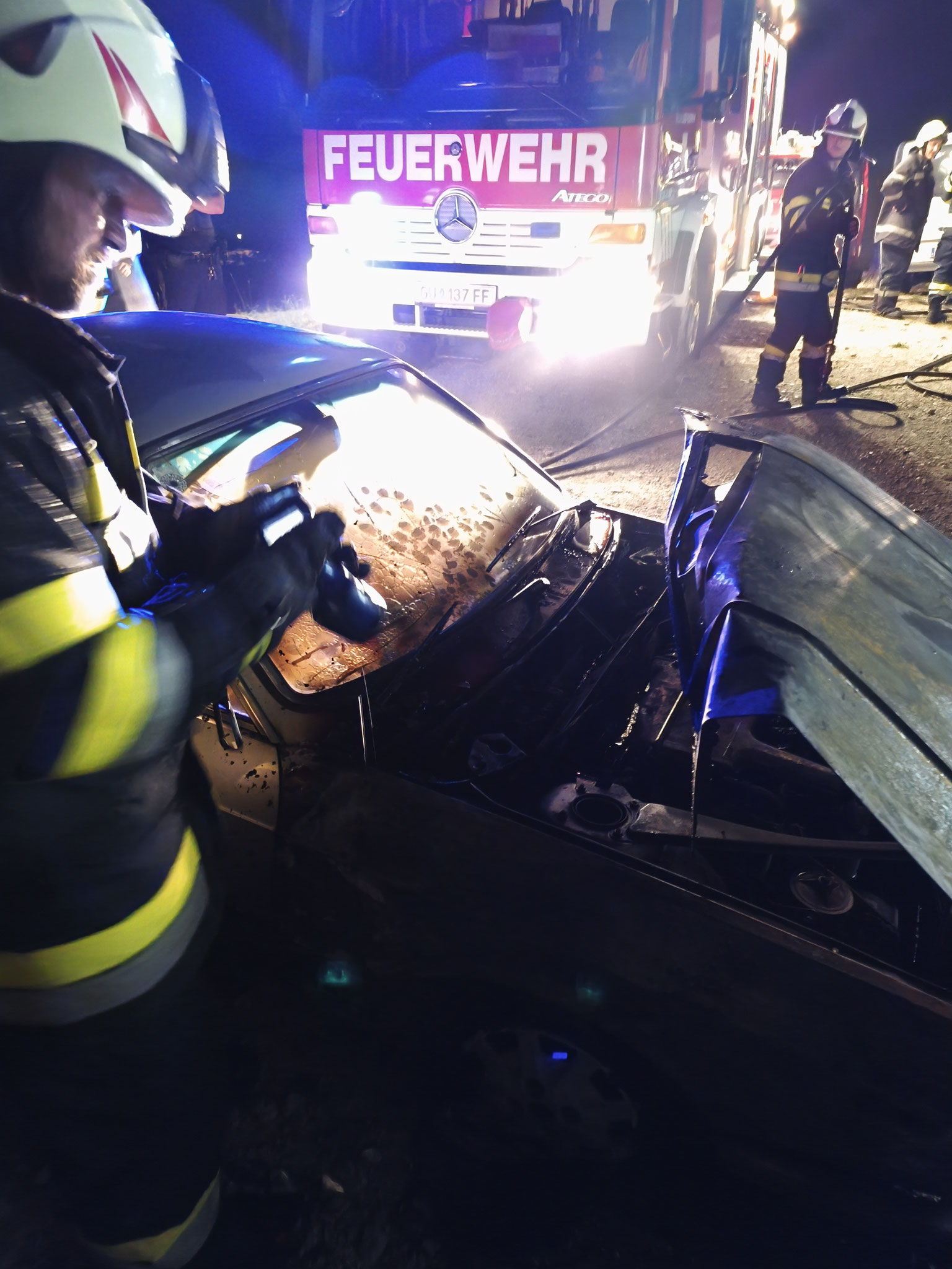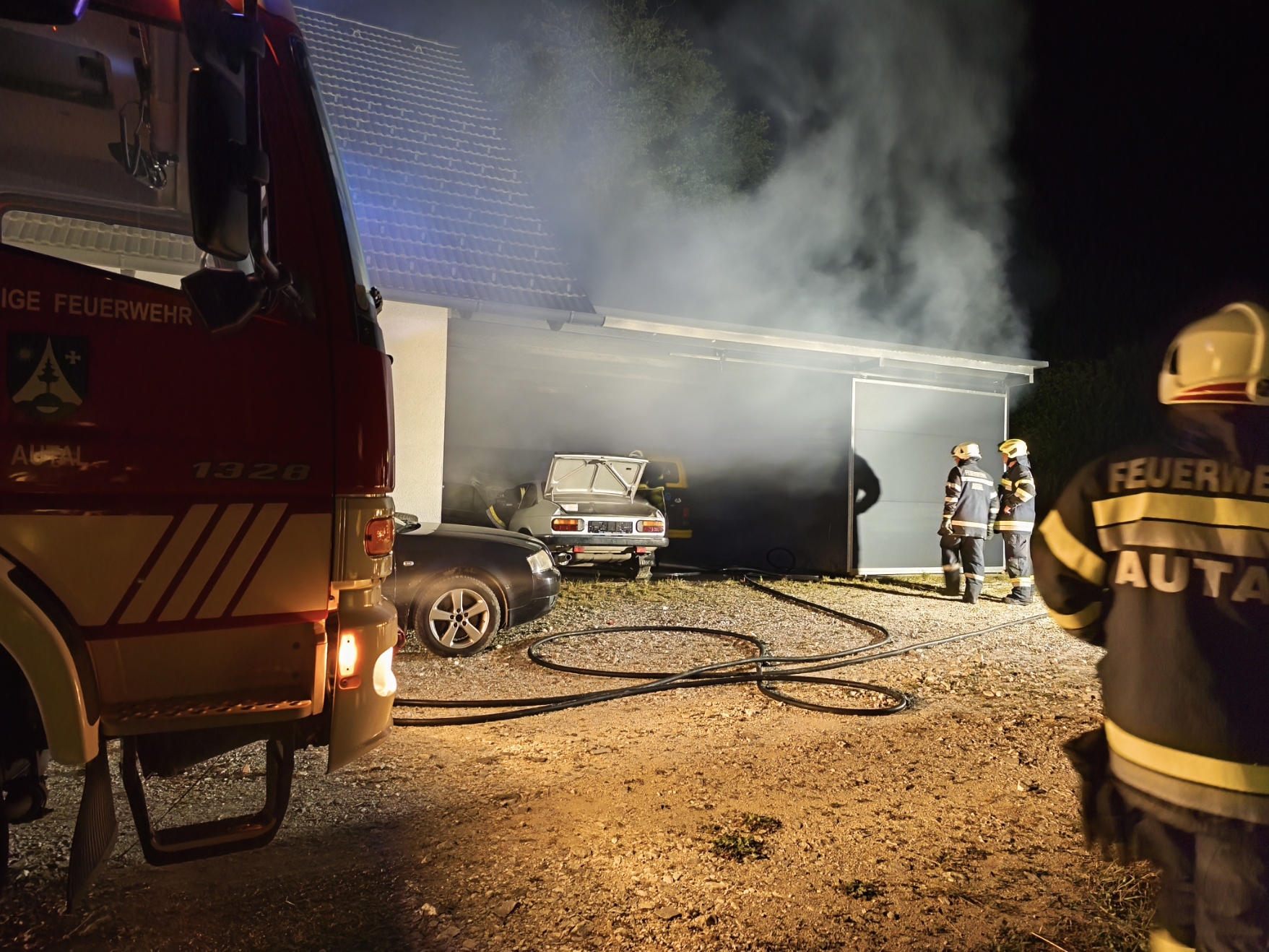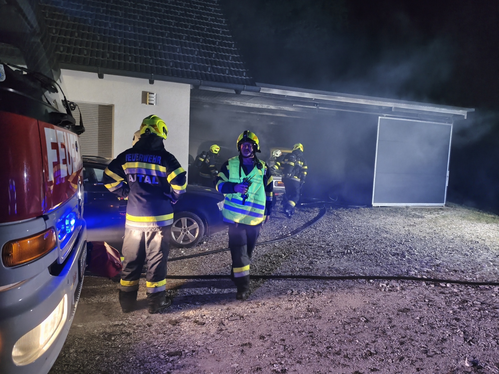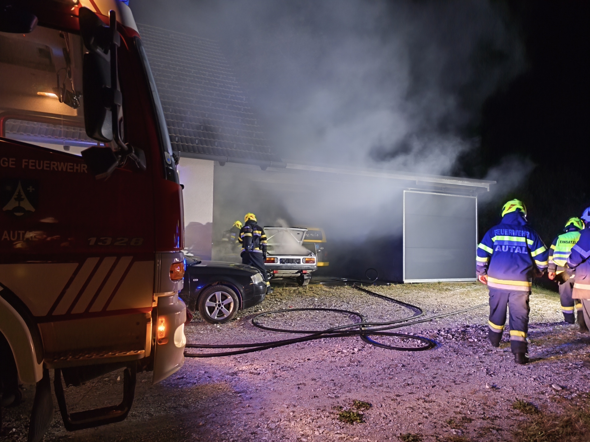 Weitere Aufgeben der Feuerwehr Autal waren: Kontrolle auf Glutnester mit Hilfe der Wärmebildkamera, Nachlöscharbeiten, die betroffen Fahrzeuge aus der Garage bergen, sowie Batterien bei den Fahrzeugen abklemmen, um weitere Zündquellen zu vermeiden. Um circa 01:00 Uhr konnte die FF Autal, nach Reinigung und Wartung der Geräte, wieder die Einsatzbereitschaft herstellen. Danke an alle eingesetzten Kräfte für die gute Zusammenarbeit.