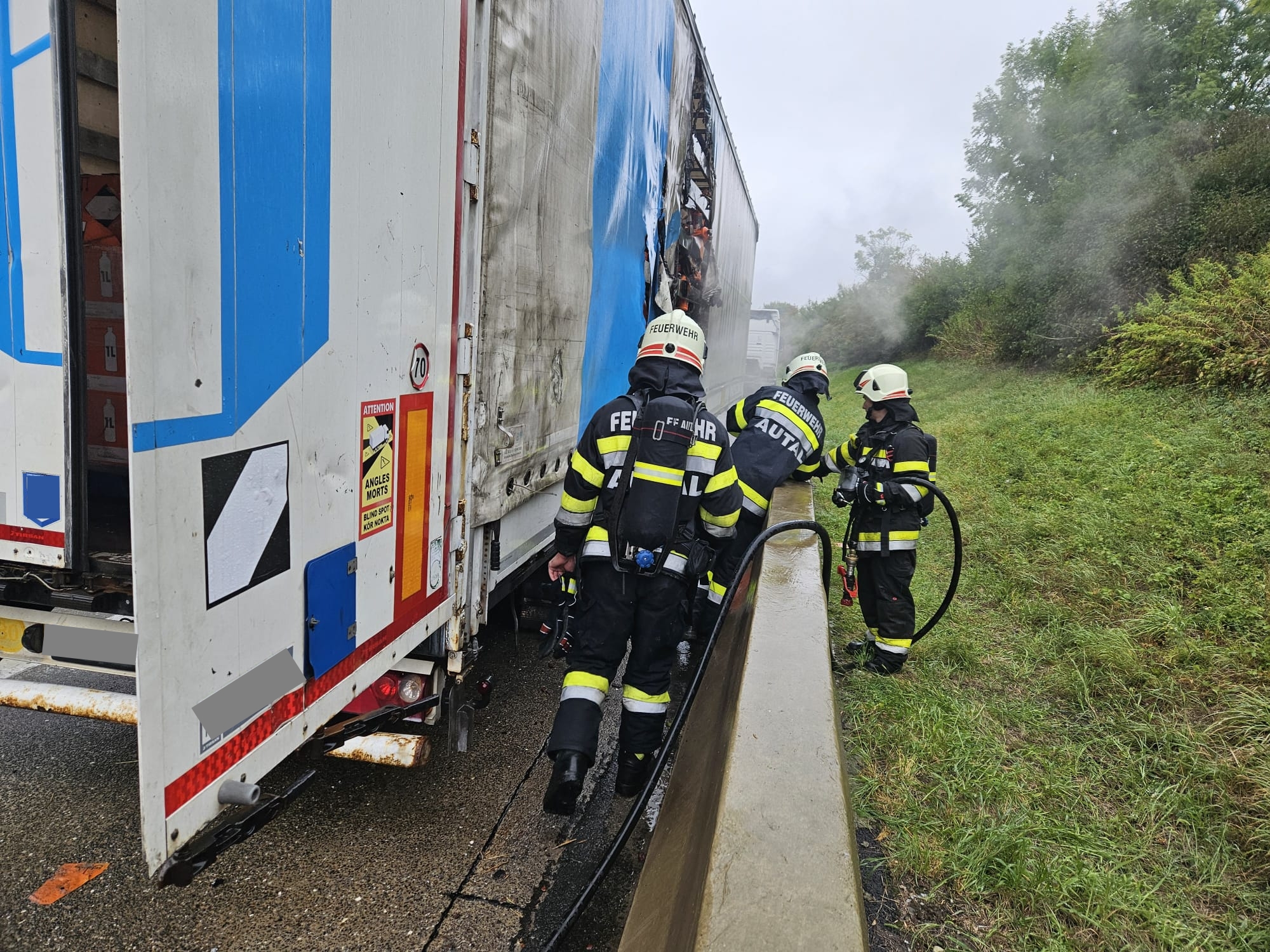 Am 10.09.2025 um 12:23 Uhr wurde die FF Autal, gemeinsam mit der FF Nestelbach b. G. mittels Sirenenalarm, zu einen beginnenden Fahrzeugbrand auf die A2 Südautobahn Fahrtrichtung Klagenfurt vor Graz- Ost gerufen. Bereits auf Anfahrt rüstete sich ein Atemschutztrupp mit schwerem Atemschutz aus. Am Einsatzort eingetroffen stellte der Einsatzleiter OLM Alexander Sudy folgendes fest: Ein Sattelaufleger eines Sattelzugs hatte aus bisher ungeklärter Ursache zu Brennen begonnen. Der Lenker des Sattelzugs versuchte den Brand mittels Handfeuerlöscher einzudämmen, was ihm nur teilweise gelang. Er blieb zum Glück unverletzt. Unter schwerem Atemschutz und mittels HD- Rohr konnte der Brand rasch unter Kontrolle gebracht werden. Zeitgleich wurde der Einsatzort abgesichert. Mit Hilfe von einer Wärmebildkamera wurde der Sattelaufleger auf Glutnester überprüft und wenn nötig noch Nachlöscharbeiten durchgeführt. Seitens der FF Autal konnte der Einsatz um circa 15:30 beendet und die Einsatzbereitschaft wieder hergestellt werden. Danke an alle eingesetzten Kräfte für die gute Zusammenarbeit.