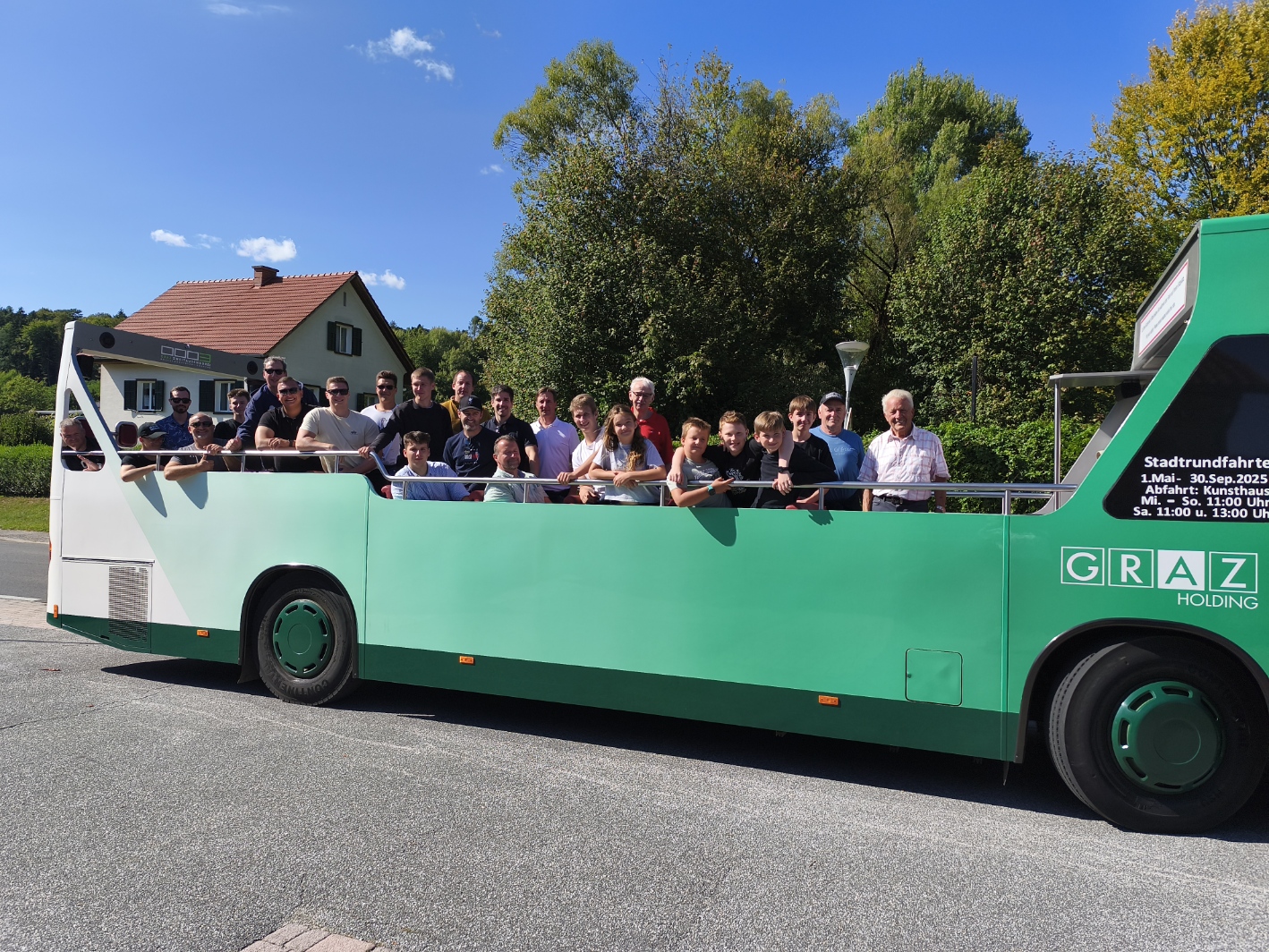 Am Samstag, den 06.09.2025 fand der diesjährige Feuerwehr-Ausflug der FF Autal statt. Unter dem Motto: „Wieso in die Ferne schweifen, denn das Gute liegt so nah“ ging es in der Früh mit dem Cabrio-Bus der Holding Graz von Autal in die Landeshauptstadt nach Graz. Erster Halt war der "Stadt Strand Graz", von wo es mit einem Floß von „Die Flößerei“ ein paar Kilometer die Mur Flussaufwärts und dann wieder retour ging. Im Anschluss holte uns der Cabrio-Bus wieder dort ab und wir fuhren Richtung Kunsthaus wo die Ausflugs-Teilnehmer in zwei Gruppen aufgeteilt wurden. Die eine Gruppe blieb im Bus und nahm an einer geführten Stadtrundfahrt teil. Die andere Gruppe machte sich auf den Weg zur Schlossbergbahn mit der die Gruppe den Schlossberg hinauf fuhr. Dort führte sie unser Kamerad PFM Markus Dehn und konnte ihnen als Betriebsleiter der Schlossbergbahn einige Highlights des Schlossbergs präsentieren. Danach ging noch zum „The Flight Graz 4D Erlebniskino“. Der Film zeigt eine zehnminütige Tour durch die Innenstadt von Graz, aus dem Blickwinkel einer Fliege. Den Schlossberg hinunter ging es im Anschluss wahlweise mit dem Lift oder der Schlossberg- Rutsche. Danach tauschten die Gruppen. Am Nachmittag fuhr uns unser Chauffeur wieder aus Graz heraus in Richtung Autal und wir kehrten zu guter Letzt beim „Heurigen Schögler“ ein, zu dem auch die Angehörigen der Feuerwehrmitglieder eingeladen waren. Ein großes Danke an den Organisator dieses Ausfluges PFM Markus Dehn!